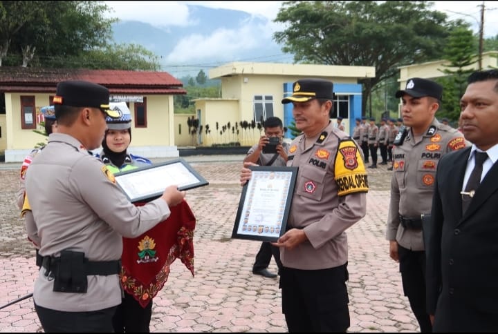 Kapolres Gayo Lues AKBP Hyrowo, S.I.K., memimpin langsung upacara penyerahan penghargaan yang digelar di Lapangan Apel Mapolres Gayo Lues pada pukul 09.00 WIB dan berlangsung hingga pukul 10.00 WIB dalam suasana tertib dan penuh penghormatan. Upacara ini merupakan bentuk nyata apresiasi institusi kepada para personel yang tidak hanya melaksanakan tugas berdasarkan mandat resmi, tetapi juga menyalurkan empati dalam kerja-kerja kemanusiaan yang menuntut keikhlasan, keberanian, dan ketangguhan di medan sulit.